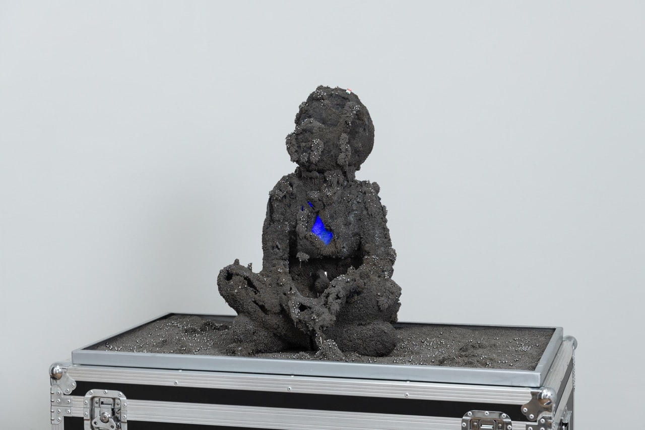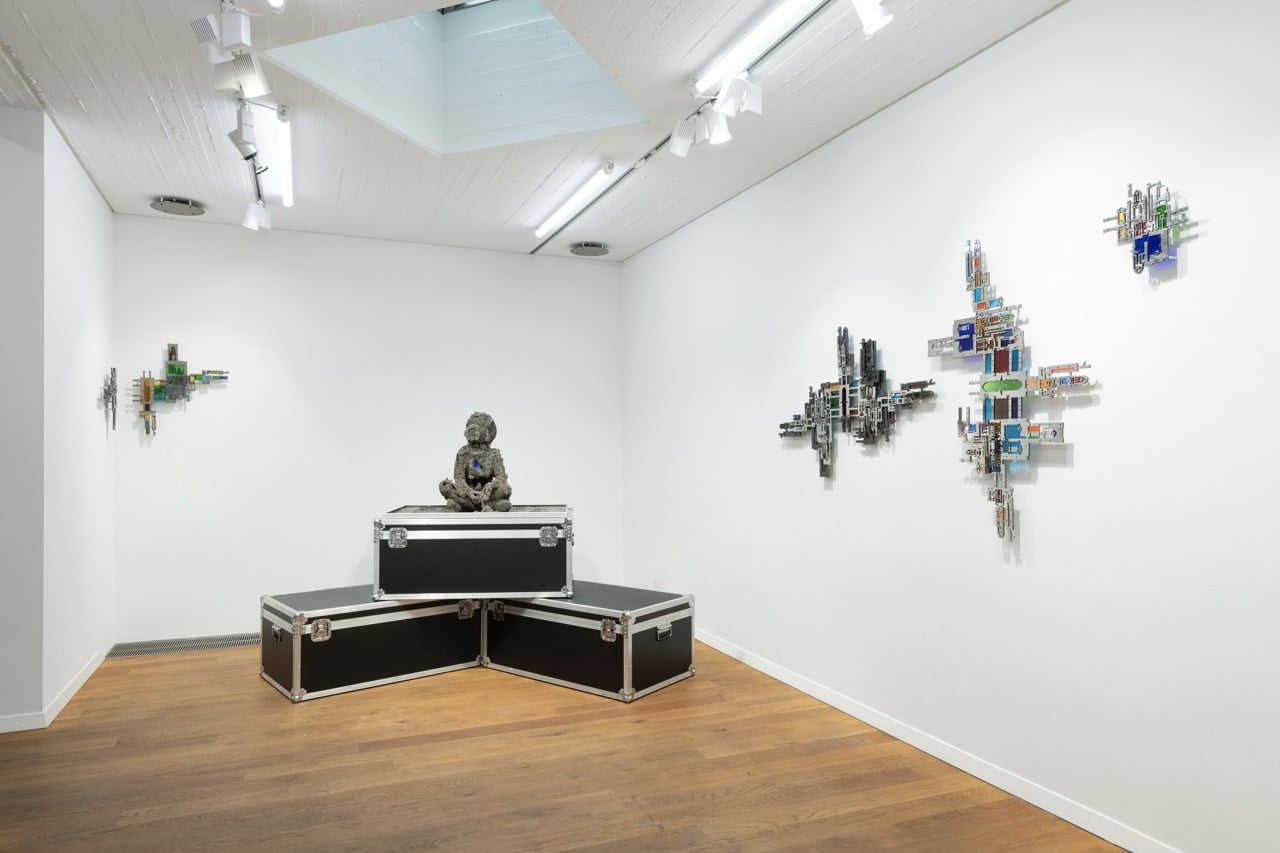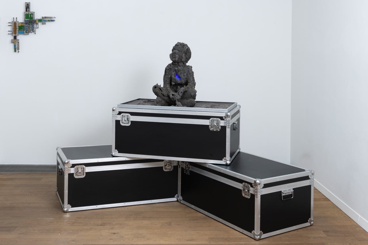 Viewers experience sculptures from various creative phases, composed of diverse materials such as stone, metal, and wood. Inside one suitcase, for instance, magnetised granules assemble into the mirrored silhouette of a train station, moved by a magnet operated through code written by the artist. Other suitcases open to reveal metal rods and coloured glass inlays that form urban-like structures, backlit by diffused light that seeps through the mosaic glass.