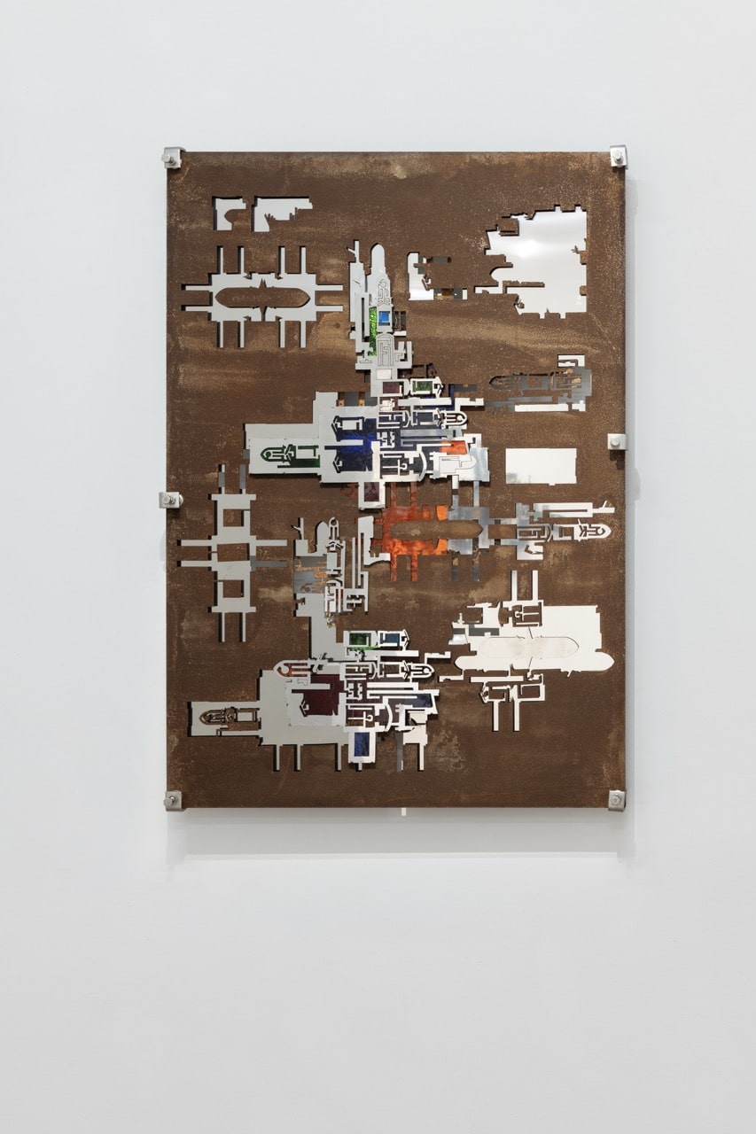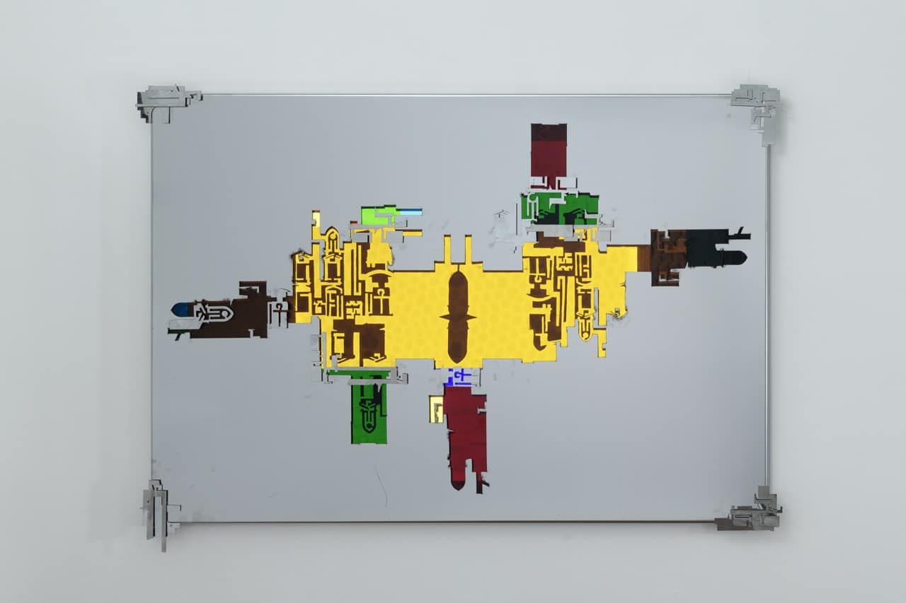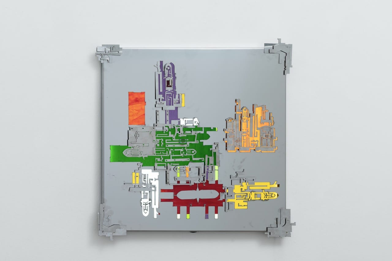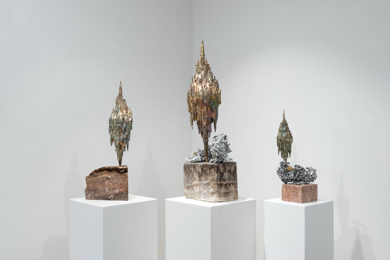 Viewers experience sculptures from various creative phases, composed of diverse materials such as stone, metal, and wood. Inside one suitcase, for instance, magnetised granules assemble into the mirrored silhouette of a train station, moved by a magnet operated through code written by the artist. Other suitcases open to reveal metal rods and coloured glass inlays that form urban-like structures, backlit by diffused light that seeps through the mosaic glass.