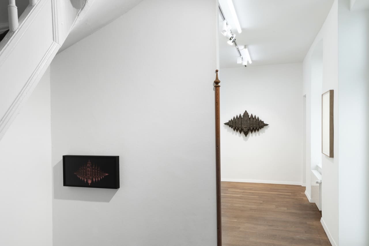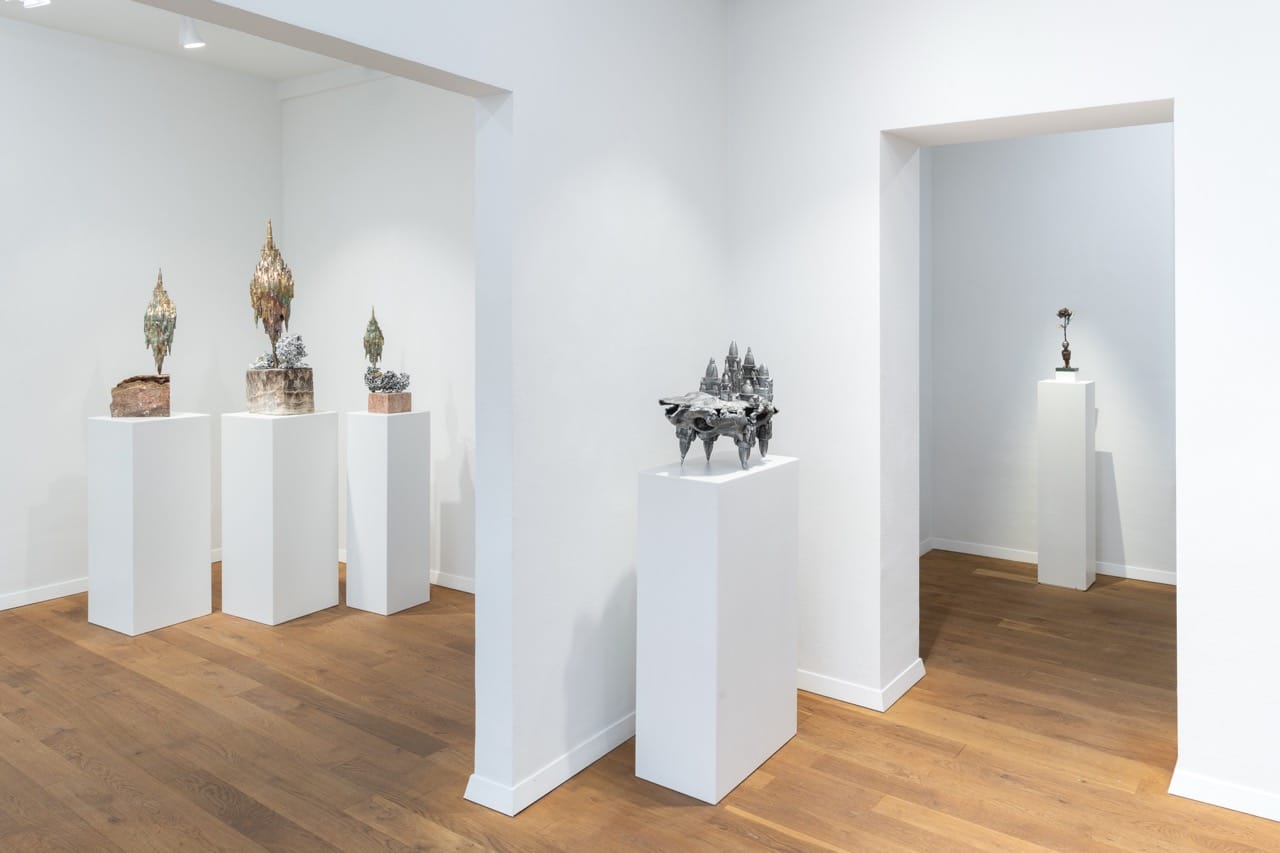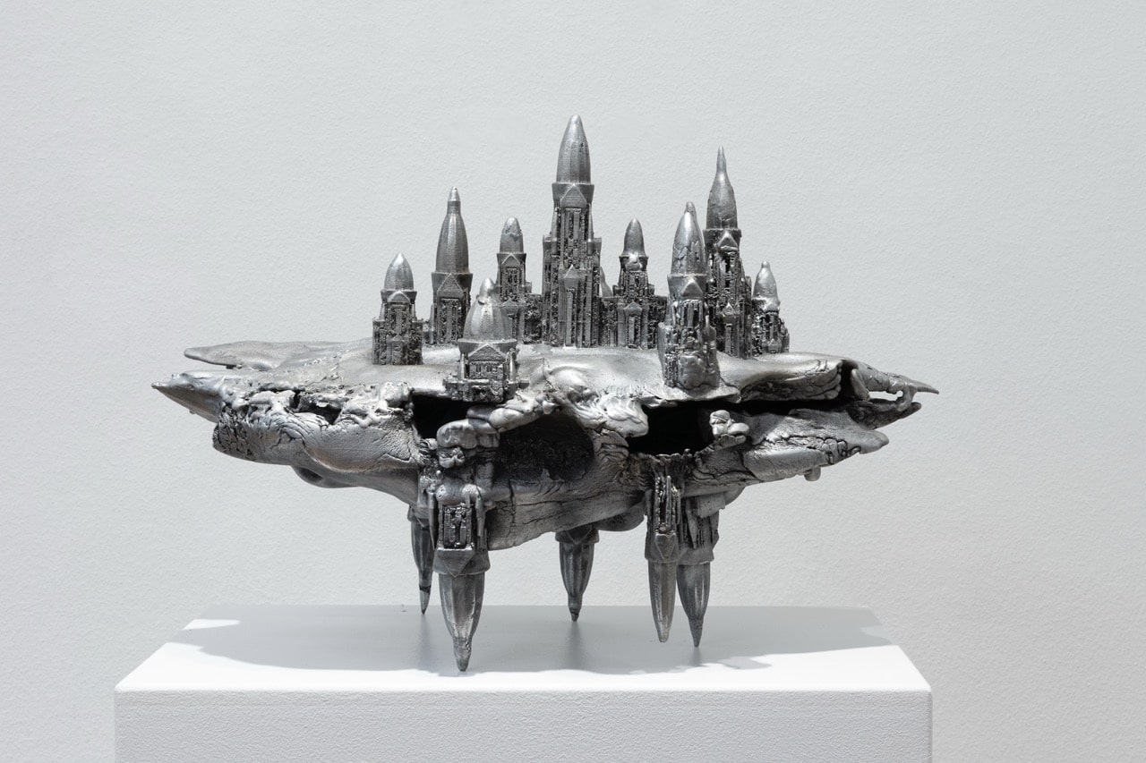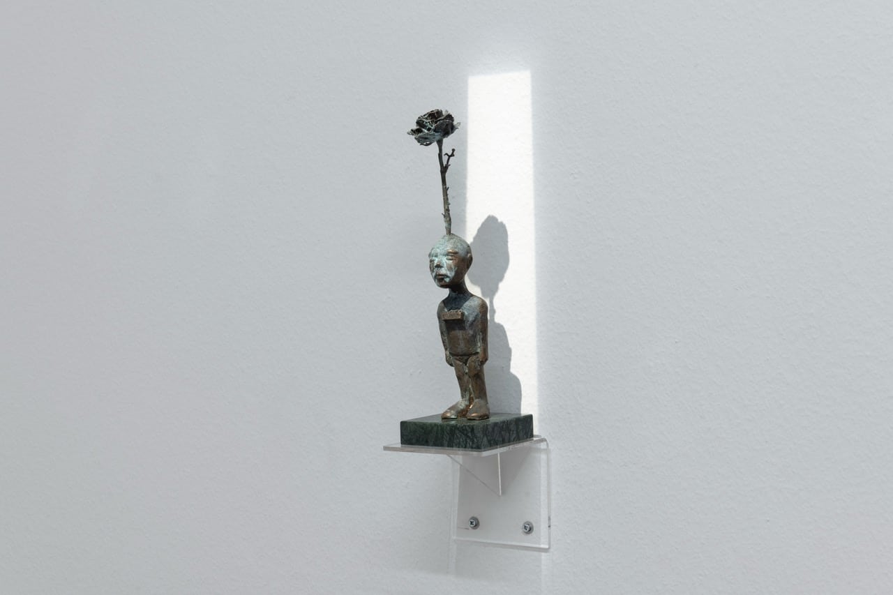 Labyrinthine urban forms recur throughout Karakaya’s practice, sometimes inspired by real cities, sometimes imagined. These hybrid structures, often spherical or mirrored, are knotted into dense networks with no beginning or end. Viewers also encounter humanoid figures, from whose heads flowers grow. Suspended in a dreamlike stillness, these figures carry the burden of biographical baggage and the psychological weight of inherited memory and migration.