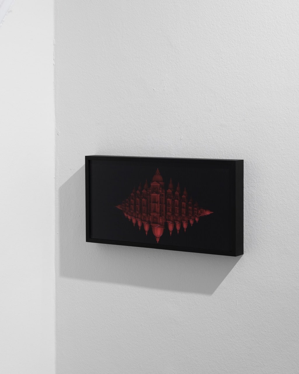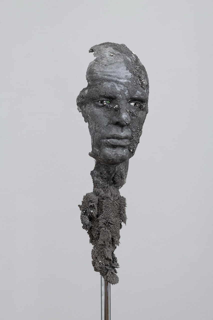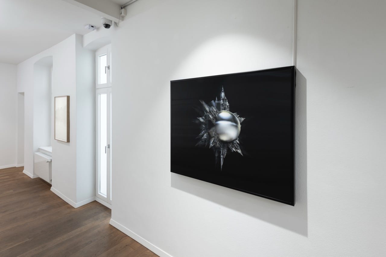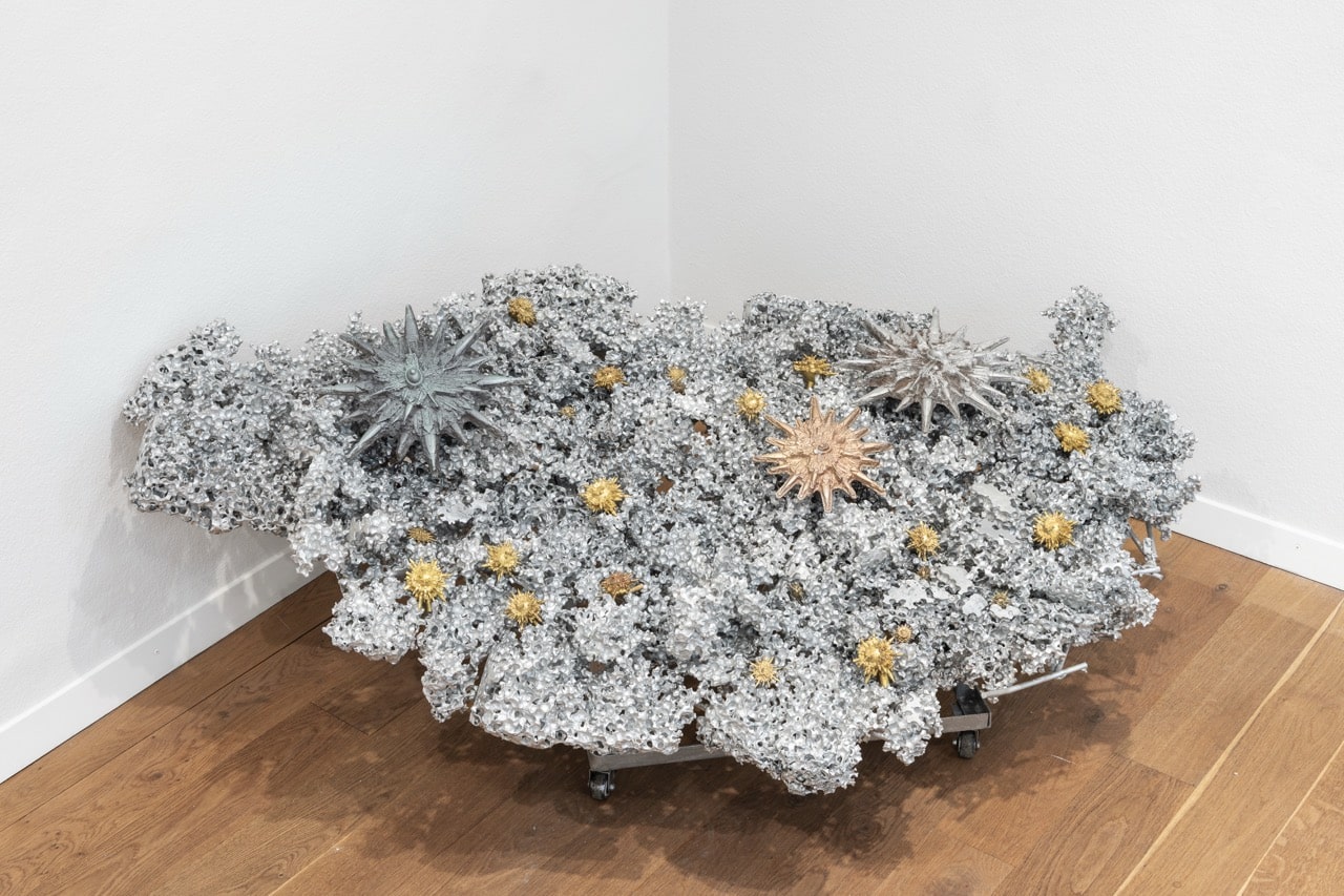 Labyrinthine urban forms recur throughout Karakaya’s practice, sometimes inspired by real cities, sometimes imagined. These hybrid structures, often spherical or mirrored, are knotted into dense networks with no beginning or end. Viewers also encounter humanoid figures, from whose heads flowers grow. Suspended in a dreamlike stillness, these figures carry the burden of biographical baggage and the psychological weight of inherited memory and migration.