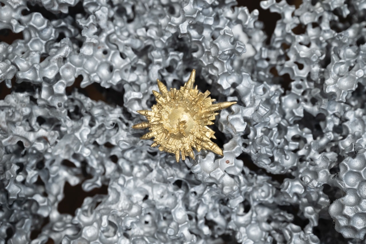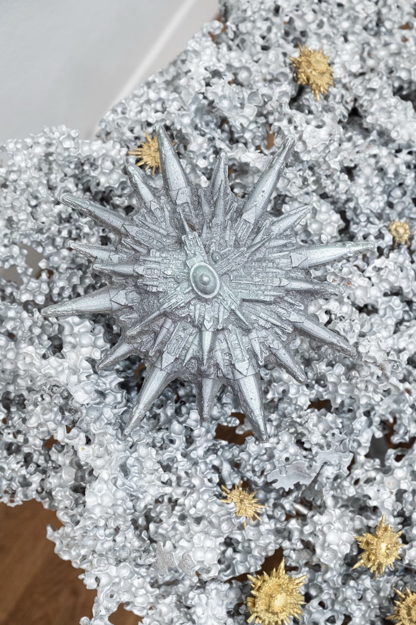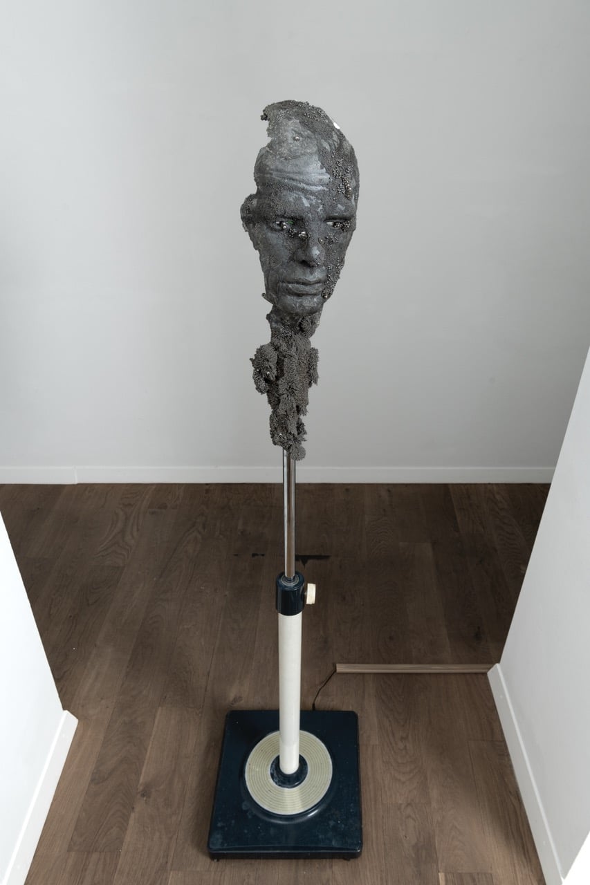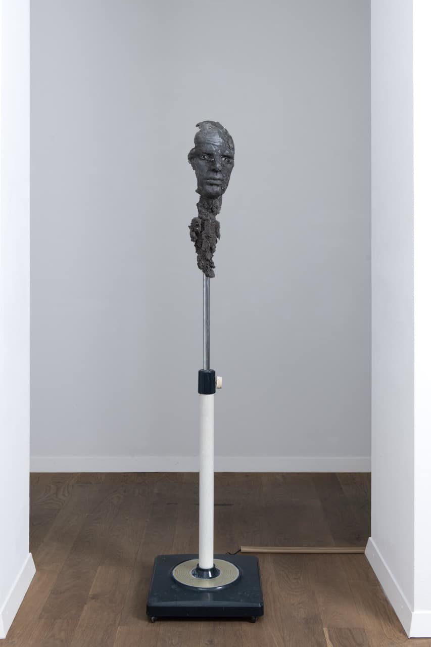 Labyrinthine urban forms recur throughout Karakaya’s practice, sometimes inspired by real cities, sometimes imagined. These hybrid structures, often spherical or mirrored, are knotted into dense networks with no beginning or end. Viewers also encounter humanoid figures, from whose heads flowers grow. Suspended in a dreamlike stillness, these figures carry the burden of biographical baggage and the psychological weight of inherited memory and migration.