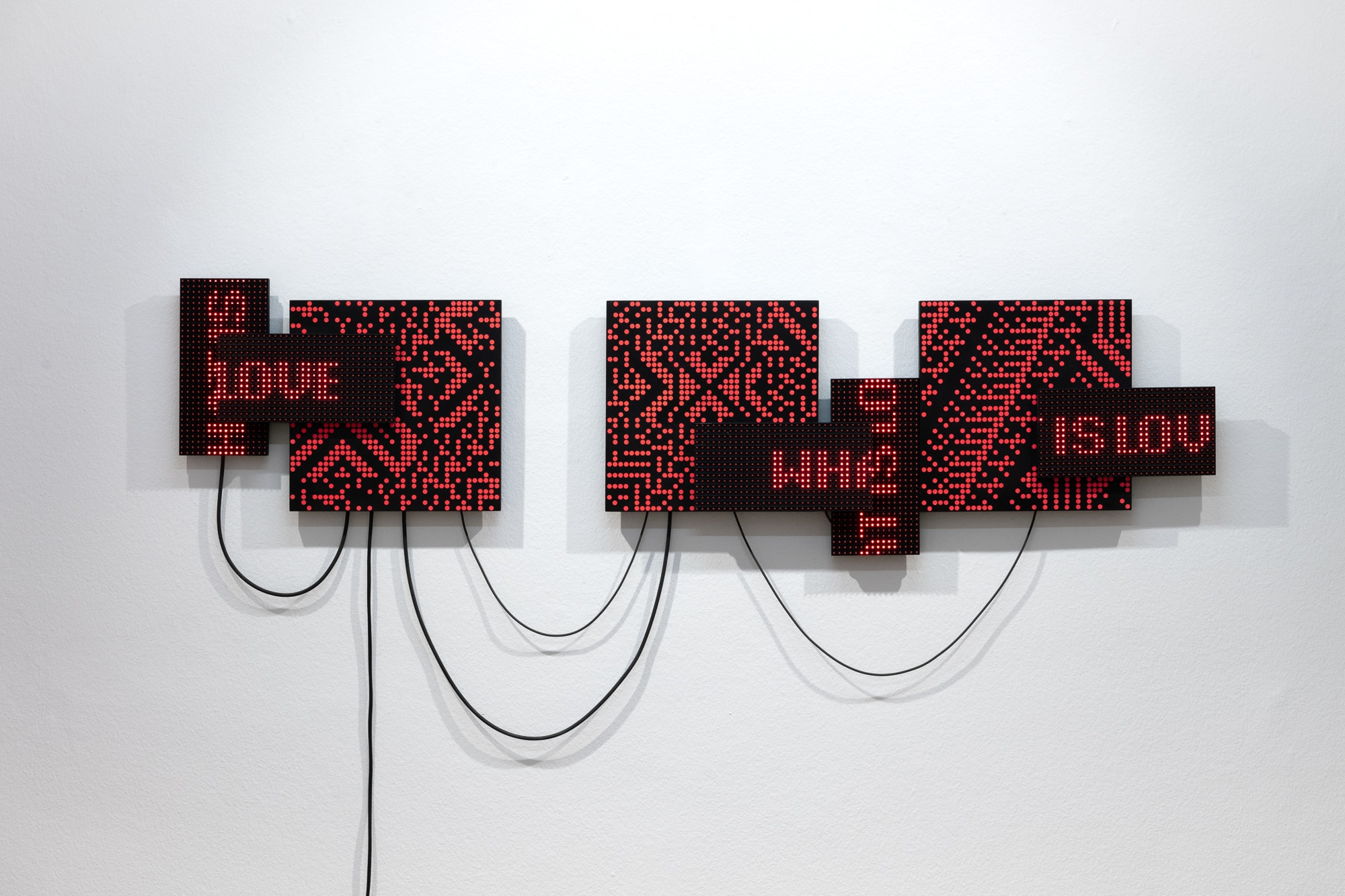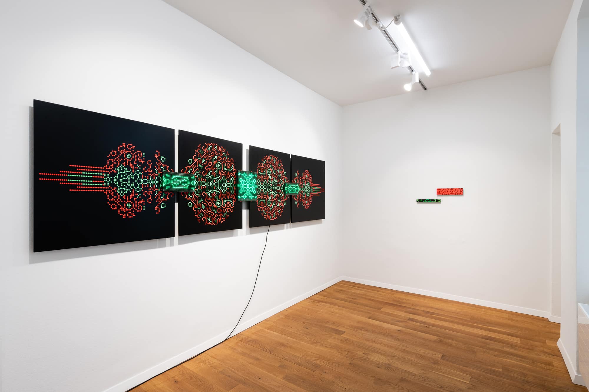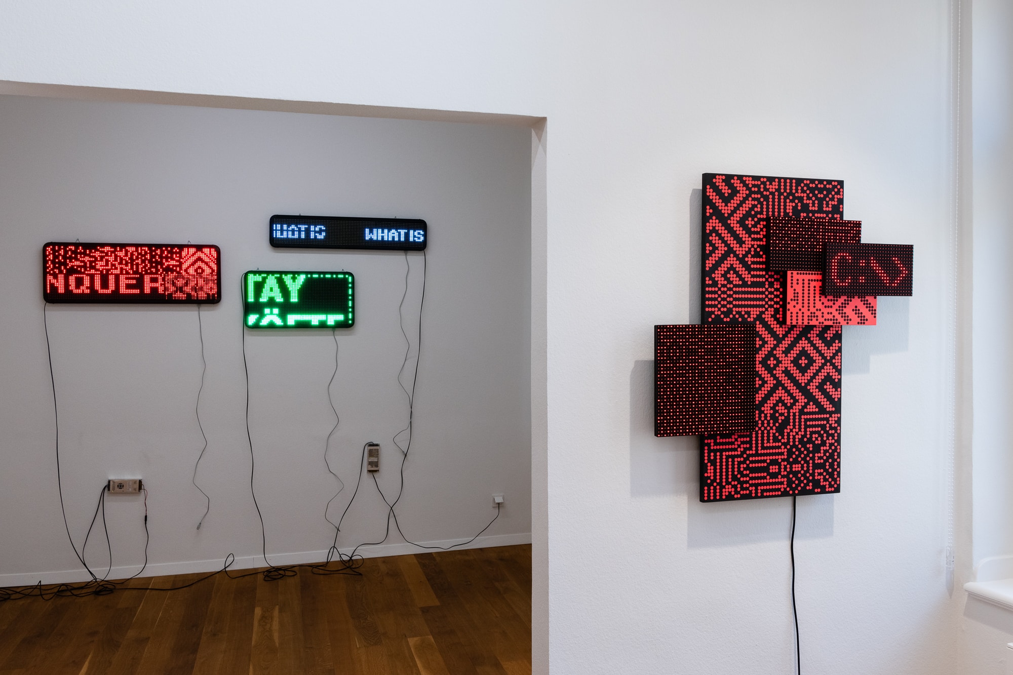 The name of the exhibition refers to the binary coding system and revolves around concepts that take their expressive power from their simplicity. By using computer codes and led panels, Sonel explores new production techniques in the intersection of new media and street art. Additionally, the artworks in this comprehensive selection are made of upcycled materials such as digital screens, MDF, LED panels, and plexi plates that are considered waste or have lost their function.